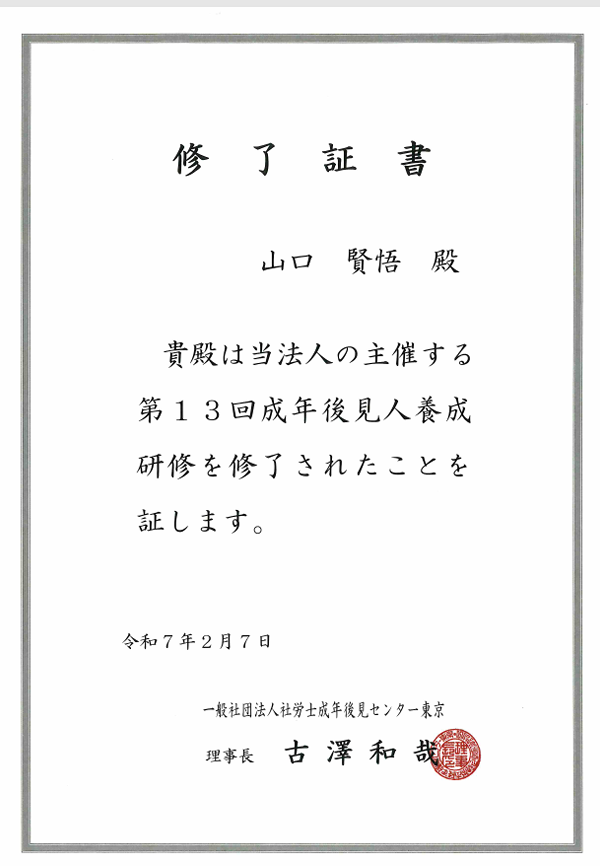 一般社団法人社労士成年後見センター東京が主催する「第13回成年後見人養成研修」を受講しましたが、修了証が届きました。